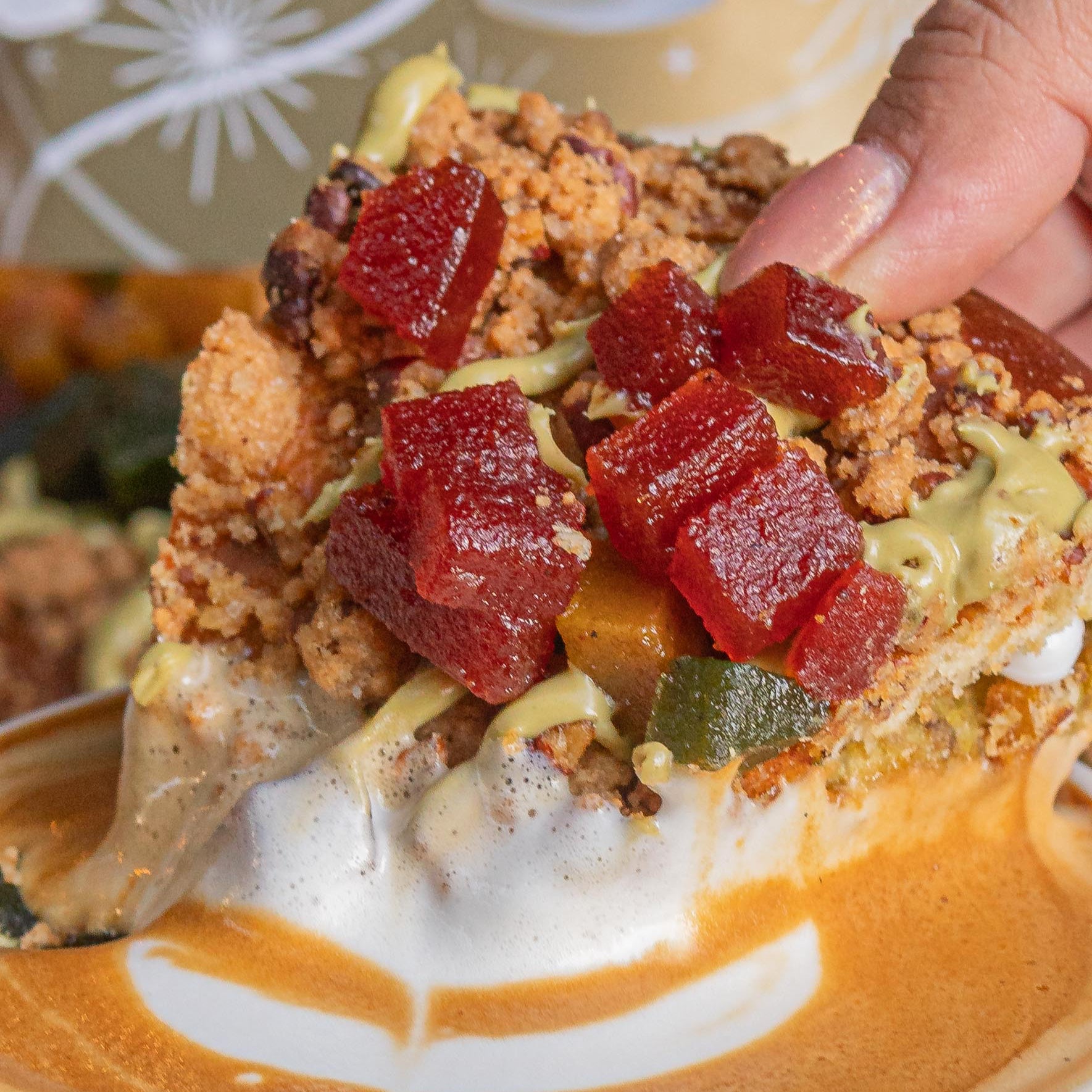 La tradicional rosca de reyes mexicana con la receta Mille Délices, una masa suave rellena de pístella con toques de naranja, frutos secos, crumble de nuez y pistache, terminada con glaseado de pístella y una corona francesa.